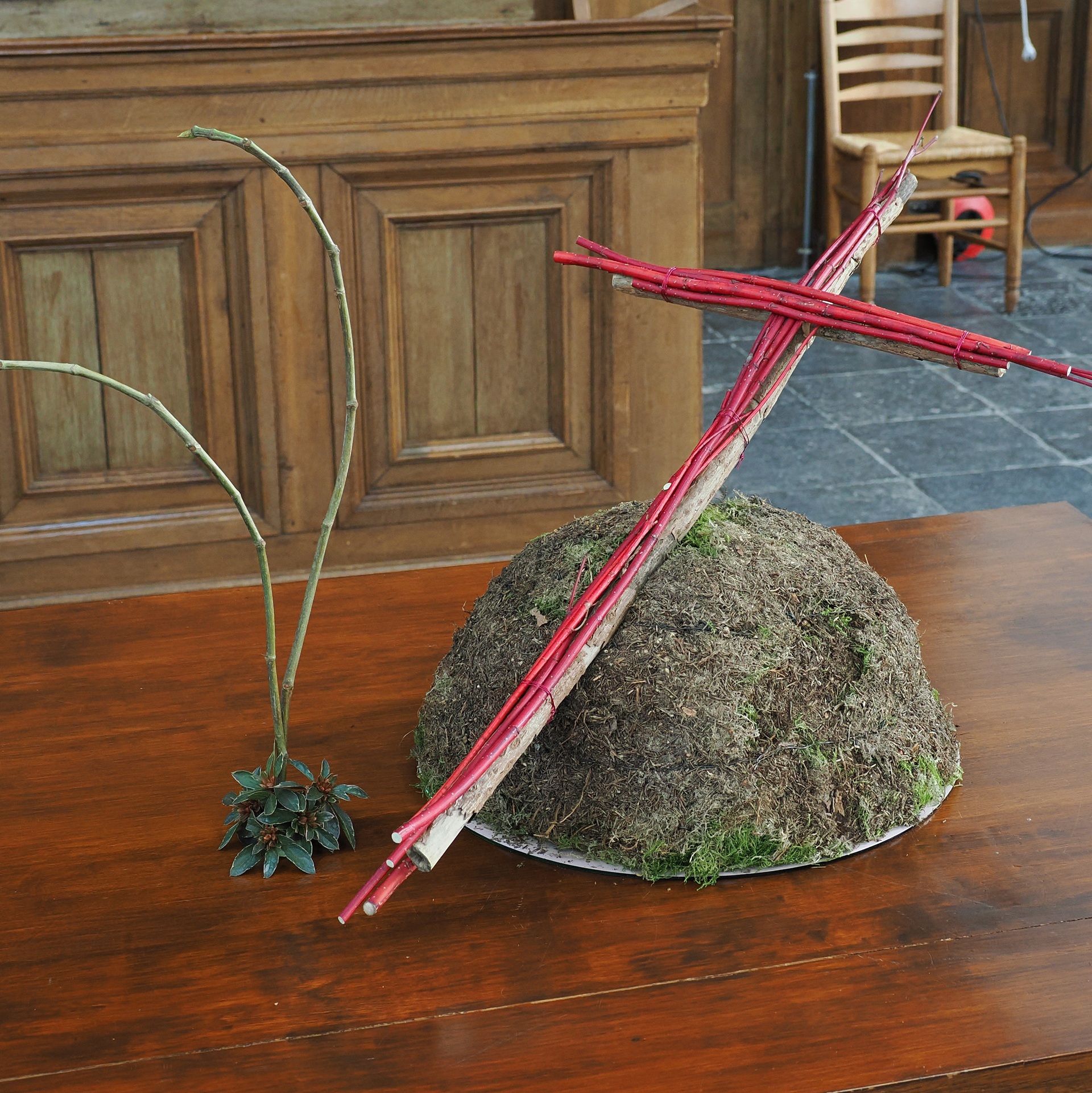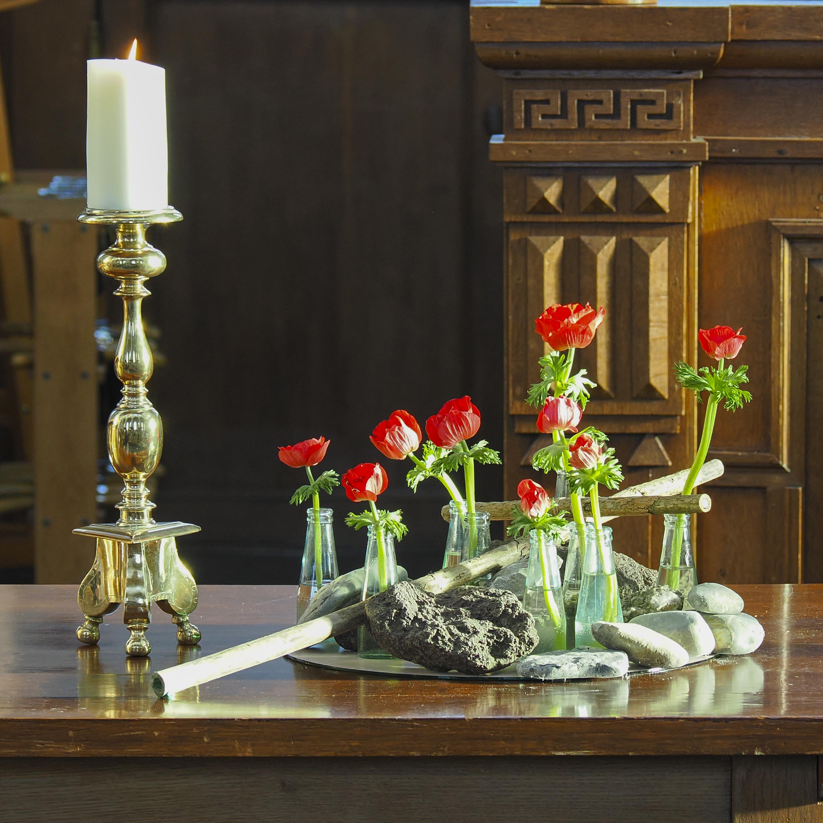 Een liggend kruis zodat we het goed kunnen zien en ons hoofd moeten buigen. De rode anemonen symboliseren het lijden, het bloed dat vloeit. De kleur van pijn en verdriet. Anemone corona - het goede gekroond.